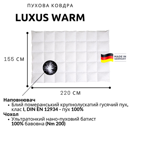Элитное пуховое одеяло Brinkhaus Luxus Warm от немецкого производителя – идеальный выбор для тех, кто ценит комфортный и здоровый сон в холодное время года. Кассетная конструкция обеспечивает равномерное распределение наполнителя и предотвращает его смещение во время использования.
